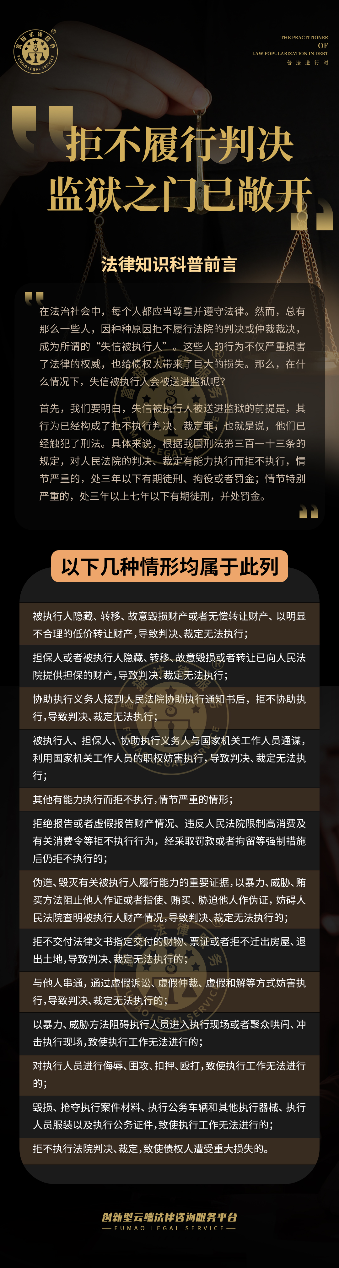在法治社會(huì)中,每個(gè)人都應(yīng)當(dāng)尊重并遵守法律。然而,總有那么一些人,因種種原因拒不履行法院的判決或仲裁裁決,成為所謂的“失信被執(zhí)行人”。這些人的行為不僅嚴(yán)重?fù)p害了法律的權(quán)威,也給債權(quán)人帶來(lái)了巨大的損失。那么,在什么情況下,失信被執(zhí)行人會(huì)被送進(jìn)監(jiān)獄呢?